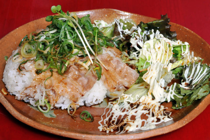 厚さ約1cmの豚バラ肉を手作りの串タレで照りッ照りに焼き上げ、ご飯に搭載し食すご馳走系丼!