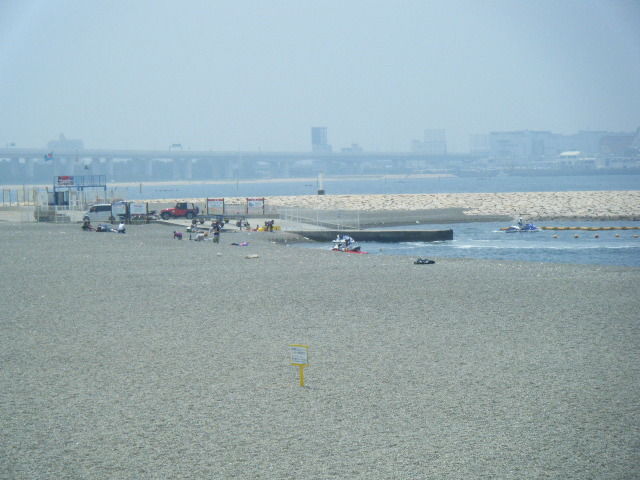 海浜緑地の砂利浜は急に深くなっており、またジェットスキーが行き来するので、水遊び・遊泳は禁止。