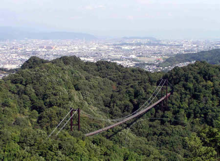 新緑を眼下に眺めつつ、吊り橋を渡る。スリル満点。